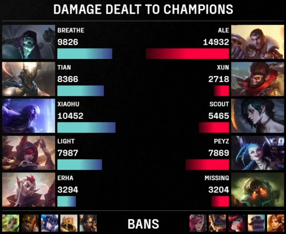 JDG在这场比赛中遭遇了多场难堪。首局,格温的表现不尽如人意。第三局,队伍迅速陷入困境。尽管Ale杰斯凭借对线优势造成了一些伤害,但其他队员的伤害普遍在5000点左右。打野Xun猴子的伤害更是只有2718点。整体表现相当低迷。比赛中,面对WBG的进攻,JDG的反应迟缓,经常被击杀,状态之差显而易见。
