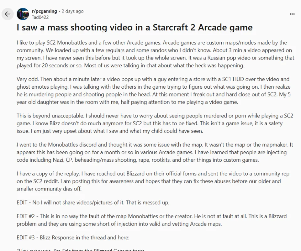近期,《星际争霸2》街机版暴露出重大缺陷。有人借此漏洞在游戏中散布了暴力枪战画面,以及可能引发光敏性癫痫的闪烁效果。此类事件并非首次发生,已持续一年有余,甚至更久,然而直至近期才受到广泛关注。4月20日,一名玩家在论坛上披露的遭遇,成为此事件爆发的导火索。