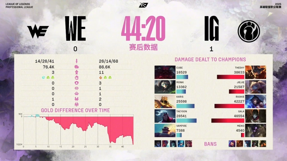 中期IG展现强势,成功击败厄塔汗。在25分钟的野区激战中,巨魔虽身受重伤却顽强存活,巨大的经济差距使得IG成功实现1换4,仅用26分钟便轻松赢得了第二局。IG的高效进攻让WE难以抵挡。