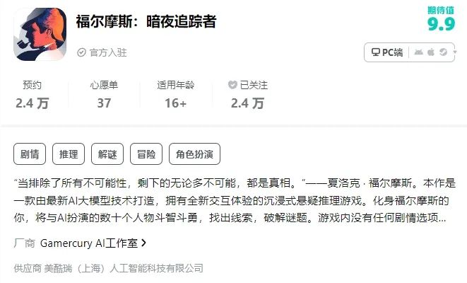 以《福尔摩斯:暗夜追踪者》为例,这款游戏在任务推进方面给予了玩家清晰的指导。然而,在执行某些任务的过程中,玩家往往需要借助特定的词汇,这多少限制了他们发挥的空间。此外,在调研过程中,我们发现大多数AI游戏目前还停留在“单一角色情感互动”的试验阶段;同时,《福尔摩斯:暗夜追踪者》并未将二次元市场视为其主要的拓展方向;尽管如此,二次元用户与AI游戏的目标用户群体之间却有着较高的重叠比例。